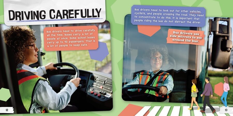 There's a lot of preparation that goes into being a bus driver. From inspecting the bus for safety to keeping it clean, some of this work goes unseen by bus riders. Then, drivers must know the right route to take—and how to stay on schedule! Readers follow a bus driver through their day in this book. Accessible language engages newly independent readers with content that aligns with classroom learning about community helpers. Fact boxes add even more information to the colorful layout.