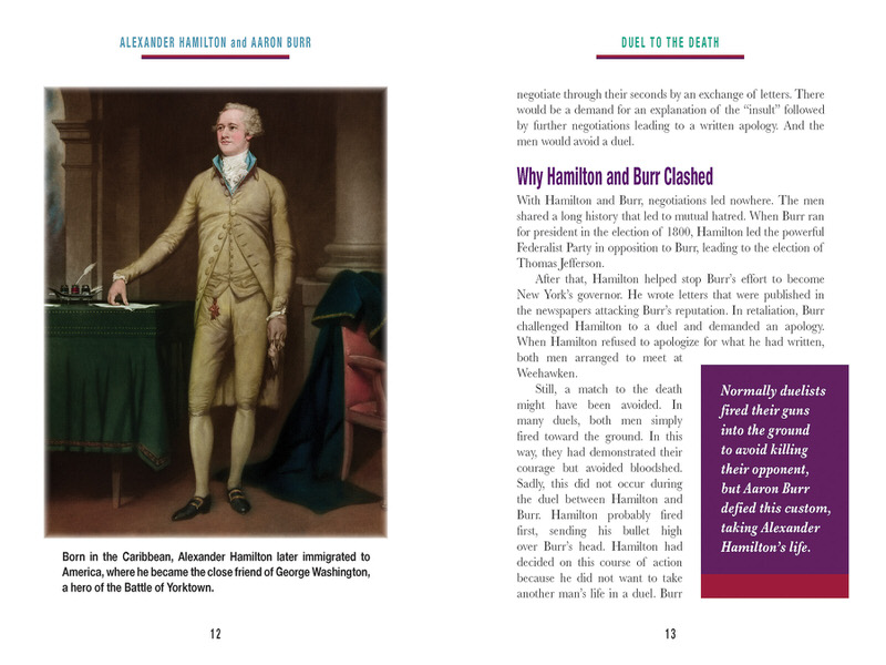 In 1804, Alexander Hamilton and Aaron Burr fought the most famous duel in American history. Both men had served with great courage during the American Revolution. Afterward, each had become an important lawyer and politician. Hamilton helped write the United States Constitution and became America's first treasury secretary, but he stopped Burr from becoming president in 1800. This move and others led to a strong hatred between the two men, which finally ended in a deadly face-off. Keep readers at the edge of their seats with this riveting examination of a history-changing rivalry.