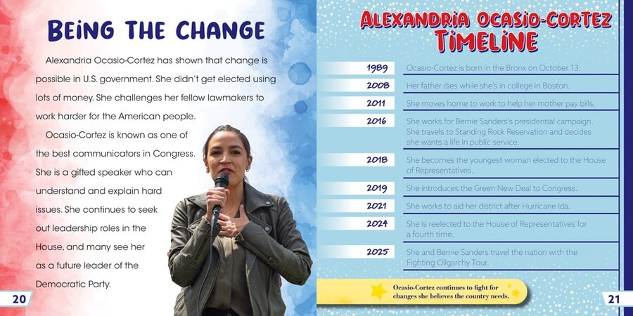 Alexandria Ocasio-Cortez is a mainstay in political news. The New York representative and Democrat is vocal about her positions and is unafraid to speak up for causes she believes in. First taking office at age 29 in 2019, Ocasio-Cortez became the youngest woman to serve in U.S. Congress. This accessible biography of “AOC” tells the story of her rise in politics. Colorful photographs, interesting fact boxes, and a timeline reinforce key ideas in this informative volume, which supports components of the science of reading.
