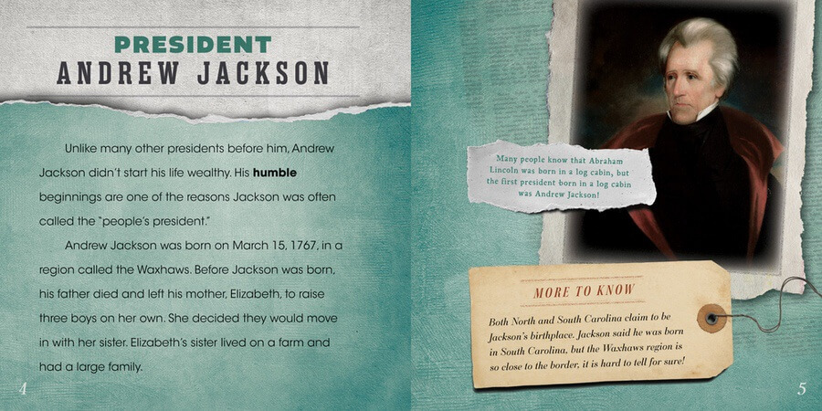The seventh president of the United States, Andrew Jackson sought to be the representative of the common man in office. After serving as a general during the War of 1812, Jackson was considered a national hero and had earned the nickname “Old Hickory.” But before Jackson joined the military, he was an orphan from South Carolina. Through this book's exploration of Andrew Jackson, readers discover how Jackson went from skipping classes and starting fights to leading the United States.