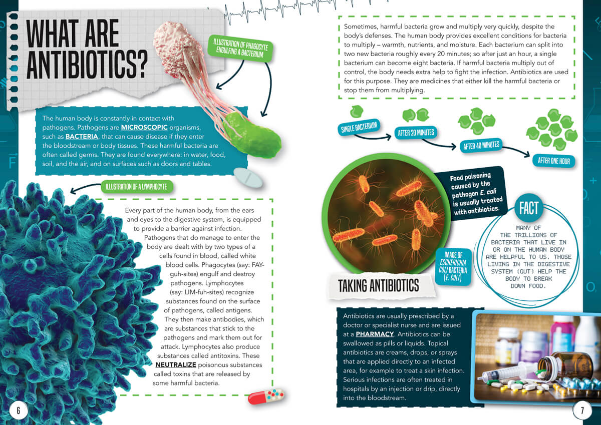 We come in contact with germs everywhere: the store, school, and in our homes. Not all bacteria make us sick, but those that do can be combatted with antibiotics. First discovered in 1928, penicillin is just one of many antibiotics that are used to treat those who are sick with a bacterial infection or have had surgery. Your readers will find out about the development of antibiotics and to how they work in the body. Resistance and the future of antibiotics are covered, juxtaposed with medical treatments used to help people before antibiotics.
