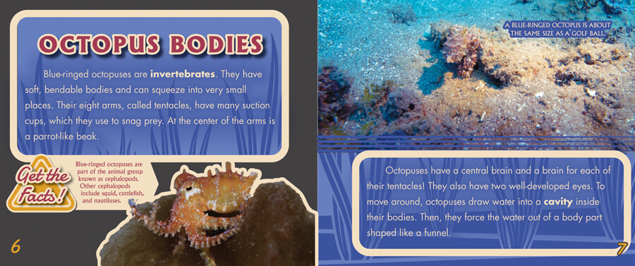While the blue-ringed octopus is only about the size of a golf ball and its glowing rings are pretty, it's also one of the deadliest animals on the planet. Blue-ringed octopuses flash their blue rings when danger occurs, and they're armed with a powerful toxin--tetrodotoxin. These critters are unique in that they are both venomous and poisonous! Readers get the chance to see these amazing animals up close without worrying about being bitten. The text is packed with fascinating facts about these fearsome marine creatures and addresses numerous topics essential to the elementary science curriculum.