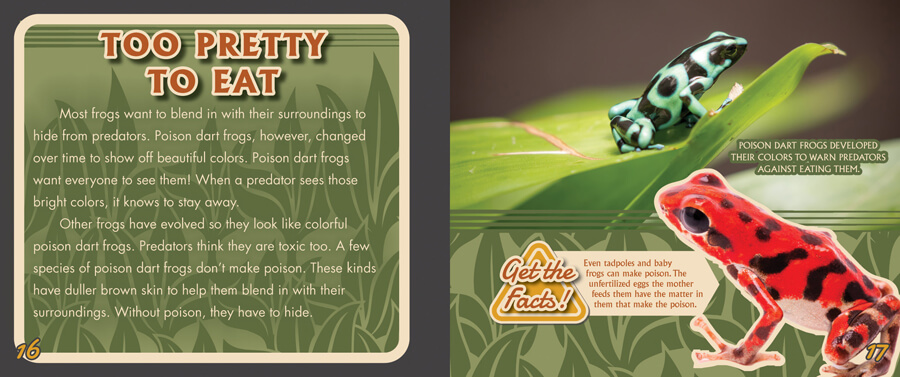 What's tiny, cute, and colorful--but also very deadly? It's the poison dart frog! These critters come in many dazzling colors to remind other animals that they are not good to eat. Just touching a poison dart frog can be enough for someone to absorb its deadly neurotoxins. Readers get a chance to see these highly toxic creatures up close in their rain forest habitats of South and Central America. Readers also learn how poison dart frogs got their name and how scientists are using their poison in modern medical applications.