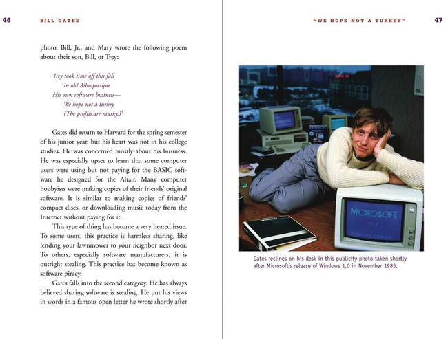 Microsoft and The Bill and Melinda Gates Foundation are both household names in America today. In 2004, Bill Gates became the richest man in the world, at the same time, the worlds largest private giver. This biography details how Gates got started and what he did to get where he is today. Both his computer developments and his philanthropic initiatives in worldwide healthcare are detailed. The book also provides an excellent and concise history of the development of the computer. It stresses that Gates made the most of both his technology expertise and his business savvy. He started his first business when he was in eighth grade. Then, when Microsoft created its software for the IBM PC, Gates set the deal so that Microsoft would earn a royalty on every copy of the software sold. Gates first made the cover of Time magazine in 1984. In 1985, Microsoft came out with Windows 1.0. Two decades later, both Gates and his wife made the cover of Time as Persons of the Year. Part of the People to Know Today series, the biography highlights the ultimate revenge of the nerd and Gates great accomplishments, but it also notes the struggles Gates has faced due to his successes., Children's Literature