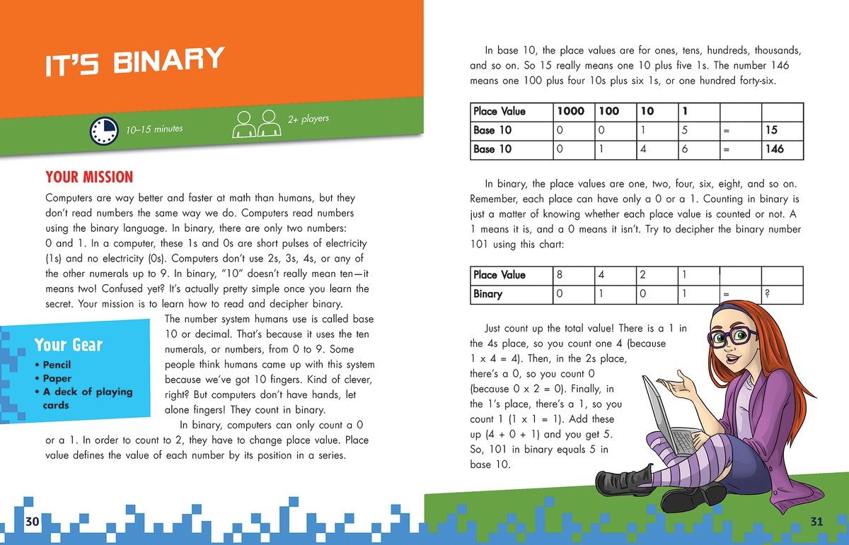 The dozen activities in this book don't require a computer, but will help readers become masters at computational thinking. This volume stars out with activities highlighting the necessity of giving clear, direct instructions. It continues to include instructions that introduce readers to concept of computer languages, commenting on codes, number systems, and the importance of binary in coding. Fun illustrations and informative sidebars help make the volume engaging, while back matter elements like a glossary and further reading section reinforce what readers have learned and offer ways to learn more about thinking like a coder.