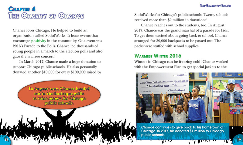 Chancellor Bennett's blazing rise to fame has made history, not only for its speed, but also in its unconventional path. Readers will learn about the childhood of the young man who would one day become Chance the Rapper. Frank but appropriate text tells the tale of a young rapper who got into trouble with drugs, but was able to turn his life around. Chance the Rapper went on to have a family and change history with his unique and memorable albums called mixtapes. Supplemented by color photographs and inspiring quotes, his story of music, family, and charity will remind readers to follow their hearts and make a positive difference in the world.
