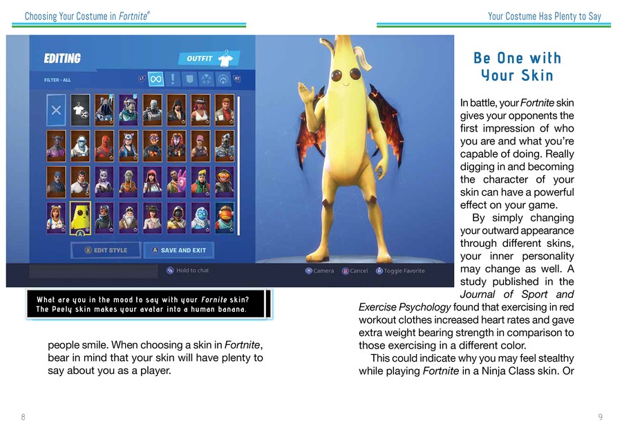 Choosing the right Fortnite skin for your game is essential! They give you energy, make you feel powerful, or even allow you to hide in plain sight for a stealth attack. A gamer's skin plays a huge role in how well he or she performs against opponents. This enlightening volume offers readers strategic tips on what to look for when choosing a skin, along with a deeper understanding as to why they may be choosing the skin they are in.