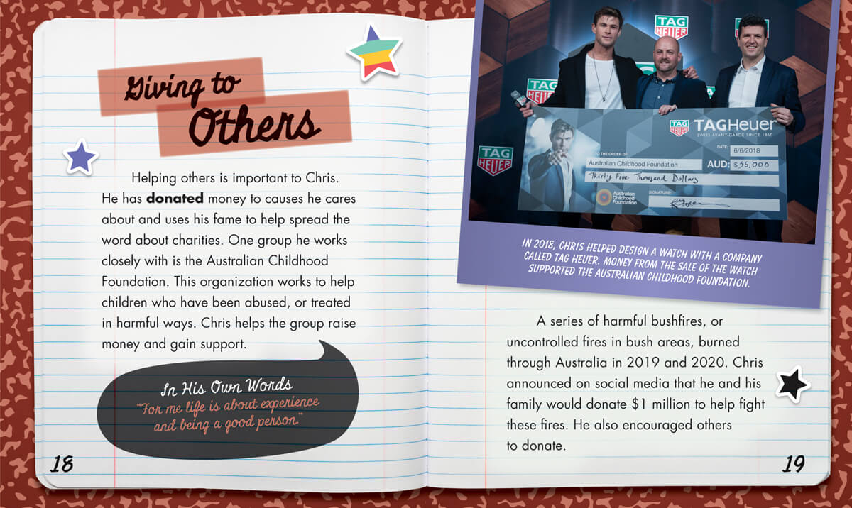 Often acknowledged as being one of the highest-paid actors in Hollywood, Chris Hemsworth has starred in many popular movies, perhaps most notably as the superhero Thor in the Marvel Cinematic Universe. But the Australian actor has done more than just act. He's also involved in a charity that helps children and has even developed an app. This volume tells the story of Hemsworth's rise to fame, from his years learning to act to becoming one of the world's best-known celebrities.