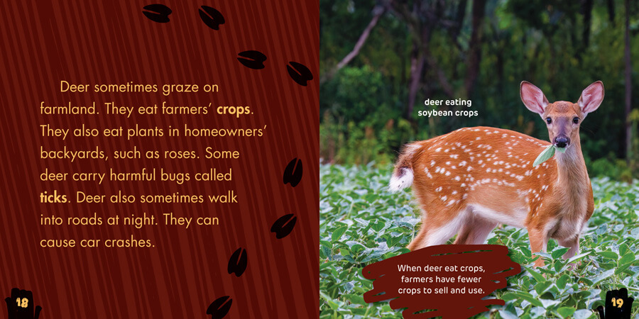 The continental United States is home to an estimated 30 million white-tailed deer! These beautiful animals are common sights in rural areas. However, they can cause a lot of damage to farmers' crops and homeowners' gardens. This book introduces readers to fun facts about deer, from their habitat to their behavior. Readers will think critically about the impact that deer have on the people and other living things around them. Accessible text is paired with vibrant photographs to give readers a thorough introduction to these majestic mischief makers.