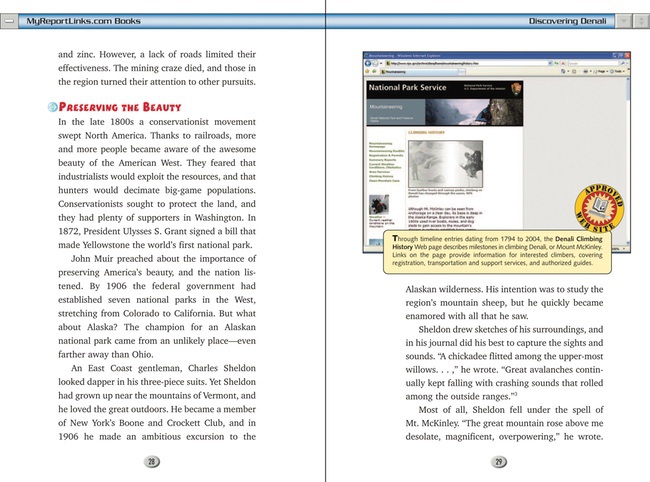 Tens of millions of years ago, clashing tectonic plates created the 600 mile chain of Alaskan mountains that includes Mt. McKinley or, as it was traditionally and is now again called, Denali. This title in the Americas National Parks series introduces report writers to the geology and history of this wilderness area and the founding of Denali National Park in 1917. Not till 1794 were Europeans even aware of the spectacular mountain range, further described by prospectors and climbers in the nineteenth century. Beginning in 1913, Charles Sheldon, member of an explorers club, began his campaign for a national park to preserve wildlife and protect the rugged area from mining and other development. Readers will learn about arctic wildflowers and fauna of the taiga and tundra, including moose, wolves, grizzly bears, and the beautiful Dall sheep. Despite its early isolation (until a railroad and some roads could be built), hiking, camping, and climbing Denali have become more common now; the remote park is purposely underdeveloped, so trips there are very expensive. Photos in this book are better than in others of the series, though the main focus is to direct students to thirty appropriate Internet sites where further exploring can be done (sites are linked to the publishers website). A good deal of information is included in the reader-friendly text, but writers who have access to a computer will find more spectacular visuals on the National Park Services official Denali National Park and Preserve website: (http://www.nps.gov/dena/index.htm). Part of the MyReportLinks.com Books series., Children's Literature