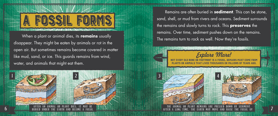 Dinosaurs roamed Earth between 230 million and 65 million years ago. That's not only long before the present day, but also long before Homo sapiens were around at all. Without fossils, we might not know anything about these fierce and interesting prehistoric animals. Young explorers will learn how fossils form, the different kinds of dinosaur fossils that scientists study, and just what we've learned from these cool fossil finds. Detailed photographs aid readers' understanding while fact boxes add more context to key science concepts.