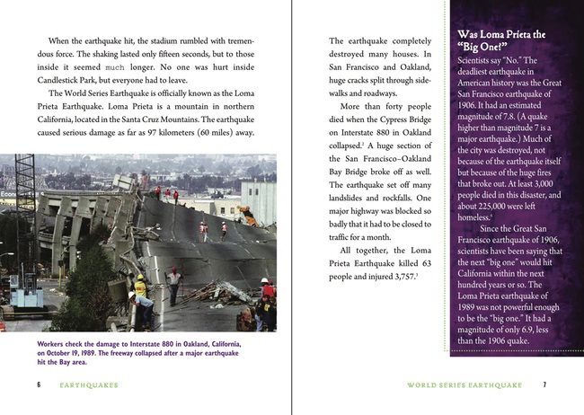 Part of Enslow's “Science Behind Natural Disasters” series, which includes hurricanes, volcanoes, wildfires, floods, and tornadoes, this forty-eight-page volume features dramatic full-color photos and illustrations that capture the excitement and terror of natural disasters sure to capture the interest of every kid (though it is aimed squarely at reluctant readers with a nice readable large print text with lots of leading, making it accessible to many levels of readers). Sidebars featuring questions and answers include really great tidbits of facts. For instance, did you know that tectonic plates move about the same distance that your fingernails grow? Chapters include the “World Series Earthquake” (the 1989 Loma Prieta earthquake in California); “Understanding Earthquakes” (tectonics, the Ring of Fire, earthquake belts, and faults); “When the Earth Shakes” (waves of various kinds, includes great graphics and photo of a huge landslide); “The Dangers of Earthquakes” (structural disintegration, liquefaction, falling objects, raging fires, landslides, avalanches, and how earthquakes are measured on both the Richter and Mercalli scales); “Tsunamis” (what they are, how they form, how the tsunami warning systems work, and spectacular photos from Phuket); and “Staying Safe” (emergency procedures, readiness, preparations and a discussion of earthquake-proof buildings). Chapter notes at the end include research information followed by a two-page glossary and further reading and internet addresses., Children's Literature