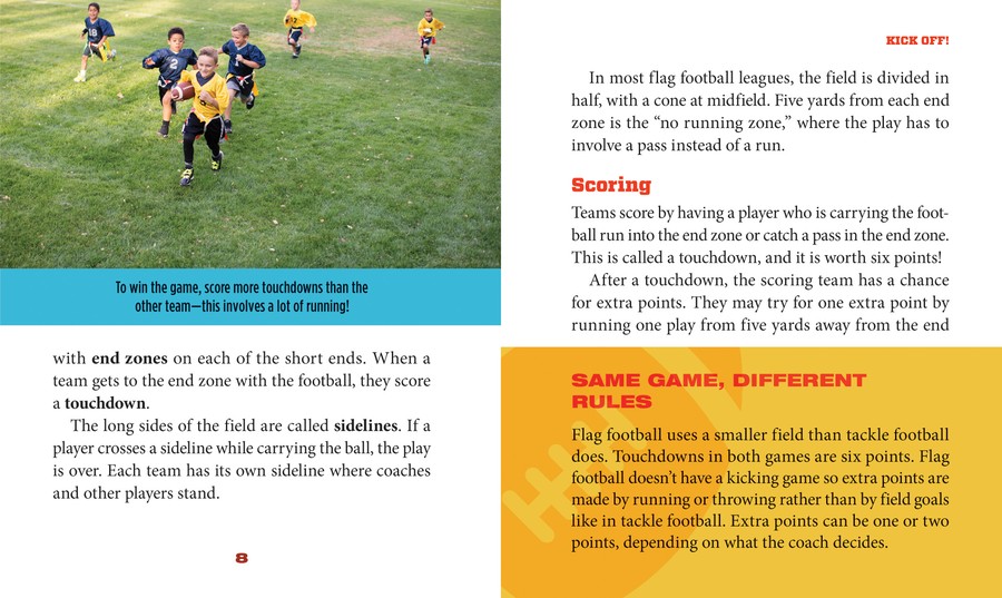 Watching pro football every Sunday may inspire kids to play football, but there's no need to start with shoulder pads and tackles. Flag football is a no-impact way to learn all there is to love about the game of football. Whether it's offense, defense, throwing, catching, or scoring touchdowns, readers explore how awesome flag football is and how they can play it in their own backyards. This book explores all aspects of flag football, with a list of words to know for a deeper dive into the sport.