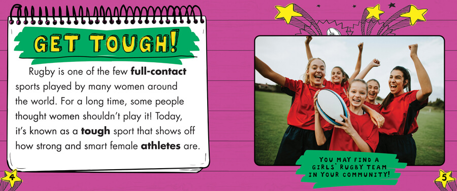 Rugby is a full-contact sport in which the players don't wear helmets or pads, including in girls' and women's leagues! But, the way players learn to hit and move make the sport safer without this gear. The tough players of rugby prove that girls can get dirty, be strong, and unleash power in sports! This book introduces young readers to the appeal of rugby through discussion of basic rules, team make up, and the leagues made for women. Full-color photographs accompany achievable text and aid understanding of each concept.