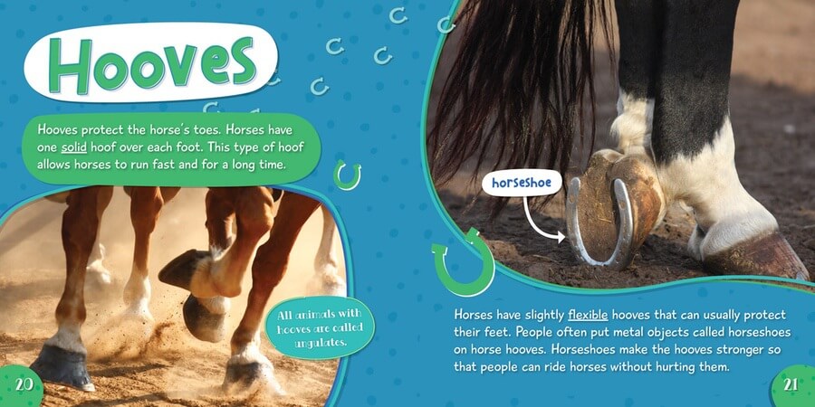 Why do horses need shoes? Why do horses have such large teeth? How many different colors are there? Horses are large and majestic, and they are often familiar to young readers. In this book, they discover the answers to these questions about horses and more! Full-color photographs bring readers close to horses of all shapes and sizes and labels added to the photographs aid readers' understanding. At-level text describes the animal from head to hoof, with lots of fun tidbits for horse and animal lovers alike.