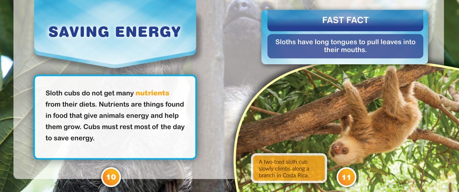 The slowest mammals on earth, sloths were born to be tree-dwellers. Sloth mothers give birth while hanging upside down! With their long, sharp, curved claws, baby sloths spend their days clinging to tree branches in the rain forest. They make their way down from the trees only once a week for a bathroom break, which makes them vulnerable to predation. Readers will enjoy an accessible yet informative look into how baby sloths grow up. Amazing full-color photographs will fascinate animal lovers while fast facts and words to know sections extend the learning experience.