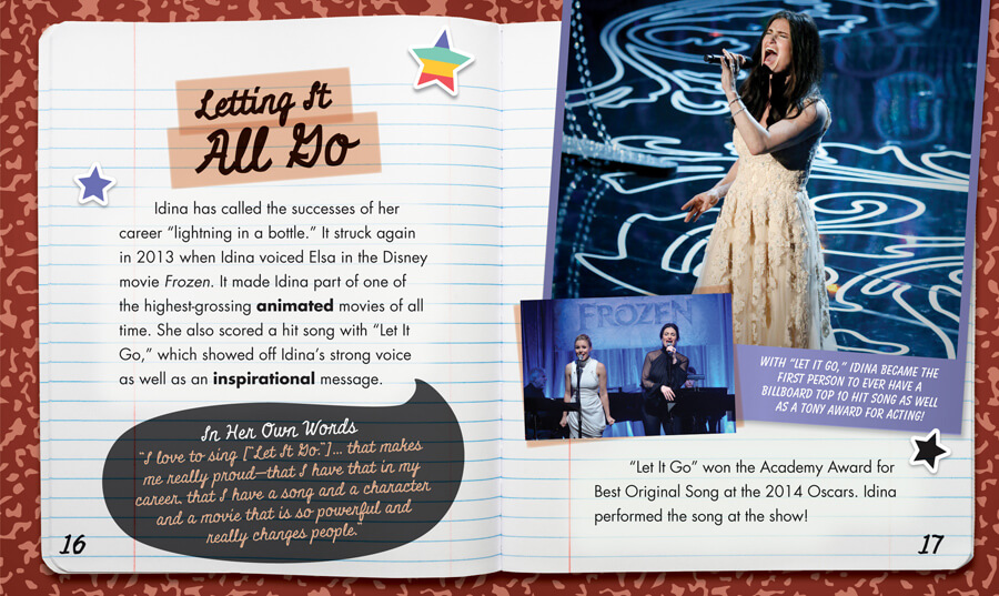 Idina Menzel got her start acting and singing on stage. When she voiced Elsa in the popular Disney movie Frozen, Menzel was introduced to a different realm of fame. Young Frozen fans and aspiring singers and actors will be immersed in this engaging biography that features quotes from Menzel and eye-catching photographs of the star. Age-appropriate text tells all about Menzel's life, from her upbringing and early roles to her big breaks and the numerous awards she's won.