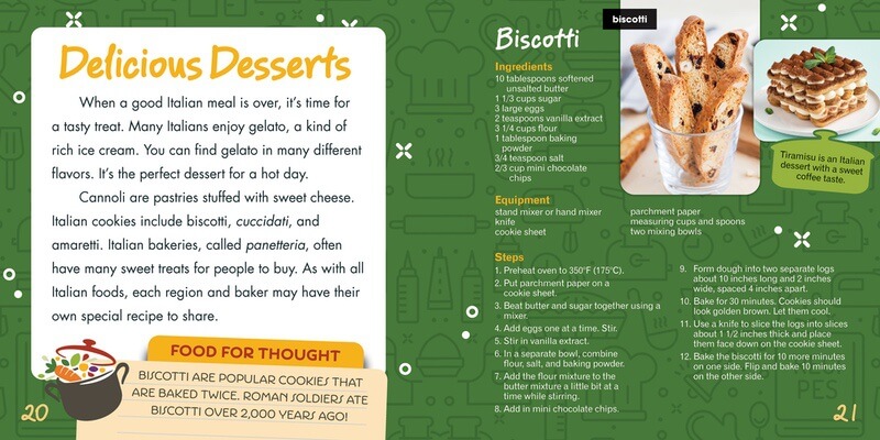 Pasta, pizza, and gelato are just the beginning of the extraordinary world of Italian cuisine. This volume explores the diverse flavors and fascinating stories that define this celebrated country. Through informative fact boxes and vibrant full-color photographs, readers learn about the cultural significance and regional variations that make Italian food a global sensation. This food tour also impresses upon readers the significance food plays in Italian culture, including the communal joy of Italian feasts and the link between iconic dishes and religious celebrations.