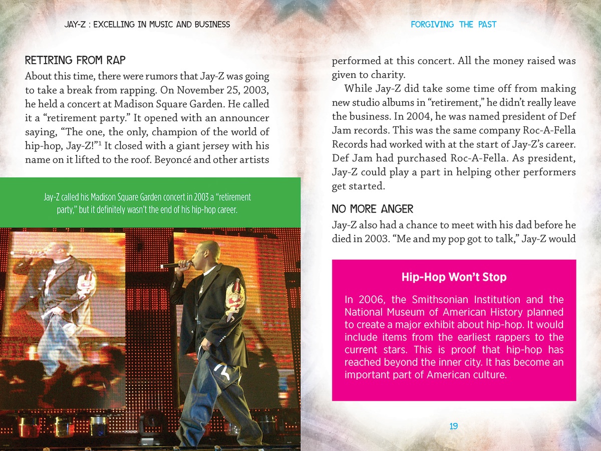 Shawn Carter, better known as Jay-Z, overcame a life of poverty in the Marcy Projects of Brooklyn and became one of the most successful rappers in the world. He has received more than twenty Grammy Awards as well as other music honors, and he has also proven to be a savvy entrepreneur with his clothing, clubs, and sports business ventures. Drawing from the rapper's own words, which are accompanied by detailed photographs and fascinating sidebars, this book provides readers with a straightforward look at the life of Jay-Z and the business empire he built.
