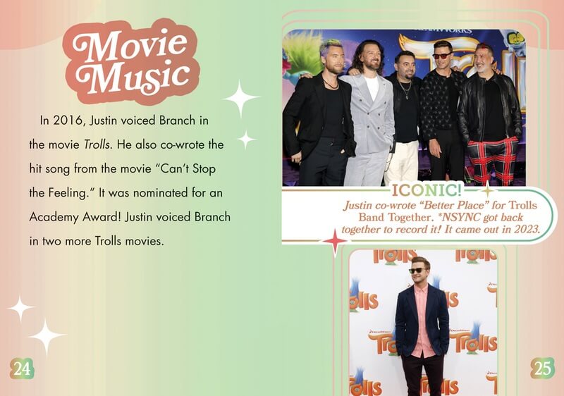 Justin Timberlake has sold millions of albums as a member of boy band *NSync and as a solo artist, and been part of huge movies like Trolls and The Social Network. One of the most iconic entertainers today, Justin is known for his wide-spread appeal—and there's no sign of him slowing down! Readers follow Justin from his start in entertainment through his meteoric rise as a member of *NSync and beyond, as well as his successful move into movie stardom. Accessible text and high-interest content, accompanied by full-color photographs of Justin through the years, draws in reluctant and struggling readers.