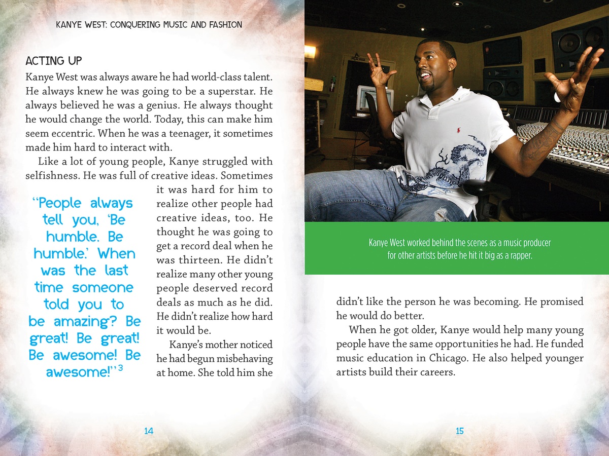 Since he was a child, Kanye West had always been considered intelligent and eager to work hard by the people in his life. He carried these traits into adulthood when he began his career as a music producer. When he turned his attention to music, he was catapulted into international fame, and Kanye continues to be one of the most talked about musical artists. Engaging text, insightful pull quotes, and intriguing sidebars reveal fascinating details about his unique childhood experiences, which drove him to succeed in the music and fashion industries, while colorful photographs draw readers closer into the artist's life story.