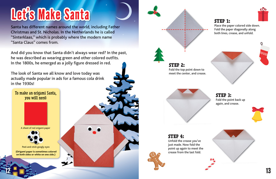 Christmas and Hanukkah light up the winter with festive celebrations, and readers learn how to add to the fun with their own origami crafts. This multicultural guide to popular holidays introduces readers to a variety of paper folding projects, including Christmas cards, Santa Claus, a menorah, and a dreidel. Clear, step-by-step instructions with visual examples help readers master each project, and helpful tips and materials lists ensure they're prepared before they begin. In addition, fun facts about the history behind these holidays are presented throughout, allowing readers to learn as they play.