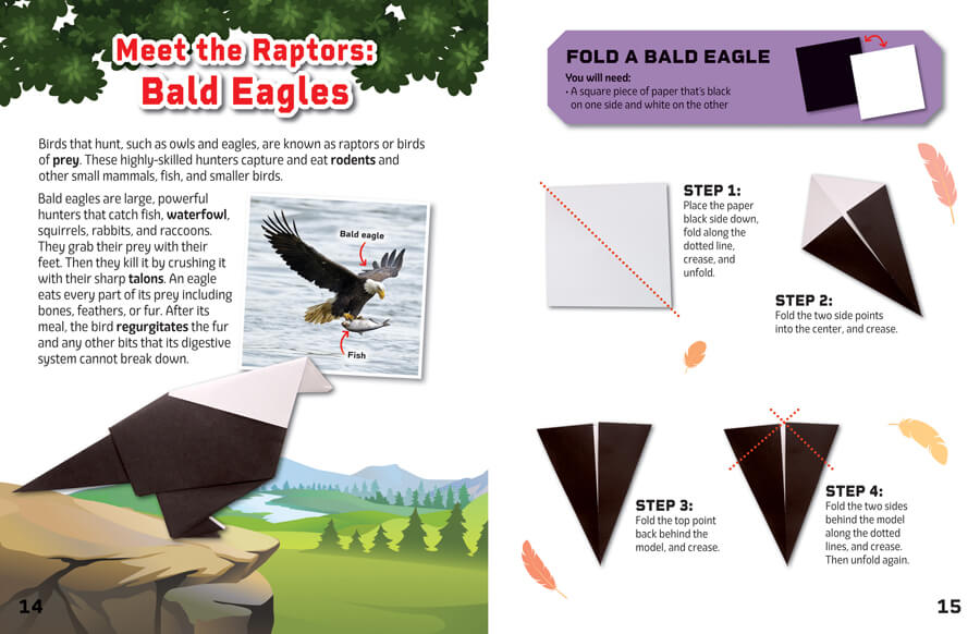 From tiny hummingbirds to huge ostriches, birds can be big, small, and all the sizes in between! There are more than 10,000 different kinds of birds, making it classification of “bird” incredibly diverse. In this book, readers understand what makes a bird a bird, from having wings to hatching from an egg. Each section is accompanied by an origami project that guides readers through making a chick, bald eagle, parrot, and more. Each step of folding includes a picture of what the reader must do and a written description. Help a reader soar into STEAM with this title!