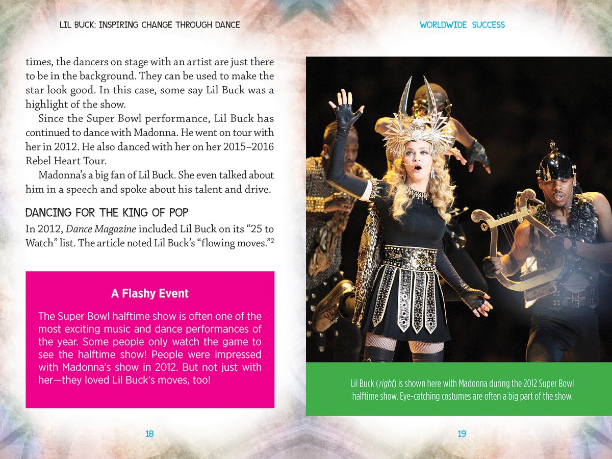 Lil Buck was known around his hometown of Memphis as a talented dancer, but after a video of him performing alongside Yo-Yo Ma went viral, he became a hit around the globe. He's added his own flair to the dance style known as jookin and has shown the world that he is a true artist. This high-interest volume includes stimulating sidebars, colorful photographs, and exciting details to help readers understand what drove Lil Buck to strive for his dreams, inspire others, and revolutionize the world of dance.