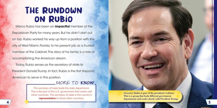 Marco Rubio has been a force in the Republican Party for many years, including running for president. He was named secretary of state in 2025 by President Donald Trump after many years in U.S. Senate. Readers explore Rubio's background in this essential biography, complete with his origins in Miami, Florida, schooling, and start in politics. Full-color photographs complement the at-level text, and a concluding timeline reviews the key points of the book. This volume supports social studies curricula as well as aids knowledge building, a key part of the science of reading.