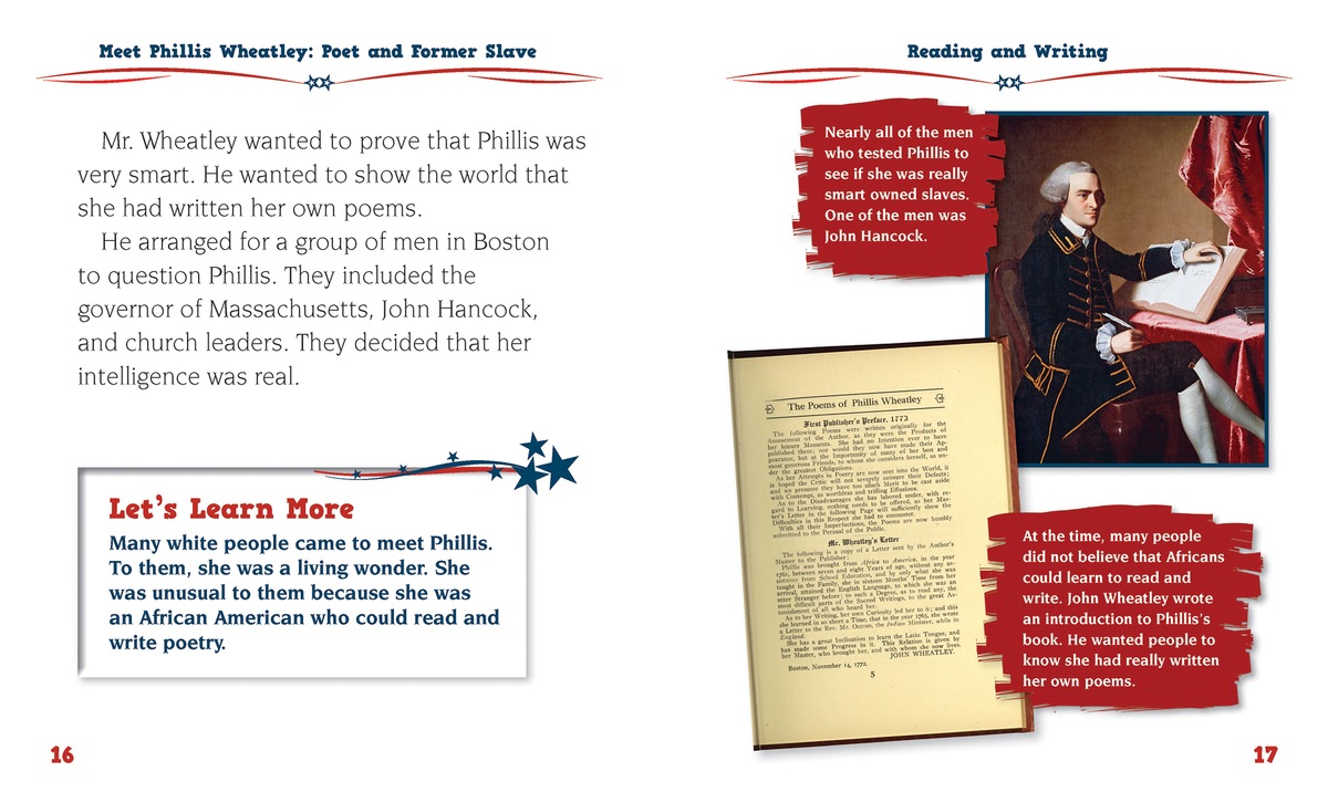 Arriving in Boston aboard a slave ship in 1761, Phillis Wheatley began what would eventually be a storied life in American. Primary sources and a thrilling narrative present the story of America's first African American female poet. Easy-to-read text highlights how Wheatley learned to speak English and to read and write. She even learned to read Latin. Soon she was writing poetry, but no one in Boston would publish her book because she was a slave. She had to look to London and found a company who published her book and put her photograph on the cover. Although Wheatley died young at age of thirty-one, her words live on and will inspire your readers.