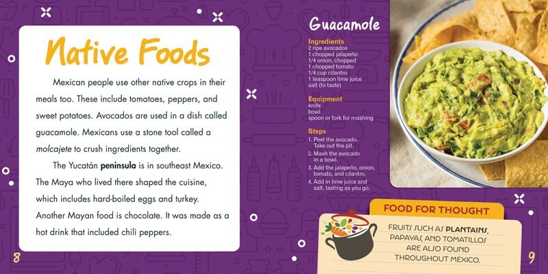 Tacos, enchiladas, mole, tres leches cake: each dish tells a tale of tradition, heritage, and the irresistible zest of Mexico. By exploring iconic Mexican dishes, readers learn about the diverse flavors and deep cultural connections that make this cuisine truly remarkable. Vibrant full-color photographs allow readers to visualize various dishes, while engaging fact boxes take a closer look at various aspects of Mexican cuisine and culture. A simple recipe is included to give budding chefs a chance to taste what Mexican food has to offer.