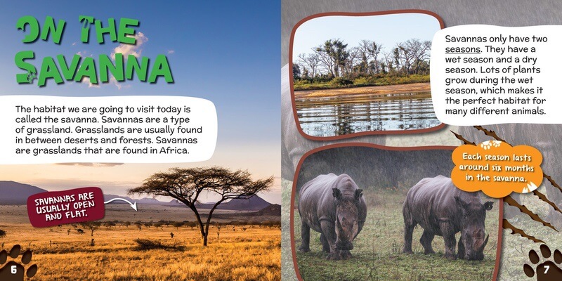 No other habitat on Earth seems as dangerous as the African savanna! From lions to elephants, the animals that live there are also reader favorites. In this engaging volume, the main text covers information about the savanna habitat and explores the animal groups that fight to survive there. Full-color photographs bring readers up close to these amazing savanna animals, supporting the main text, written just for lower elementary readers. Inclusion of facts on animal group dynamics, predators and prey, and life cycle information make this text the perfect complement to science classroom learning.