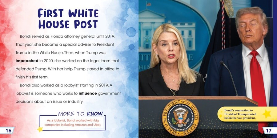 Pam Bondi was Florida's first female attorney general, serving from 2011 to 2019. Her hard work brought her to her latest challenge: 87th attorney general of the United States! In this essential biography, readers learn about Bondi's life growing up in Florida, her schooling, her work as a prosecutor, and her present-day accomplishments. The text, written especially for lower elementary readers, supports social studies curricula and aids knowledge building, a key component of the science of reading. A concluding timeline helps readers review what they have read.