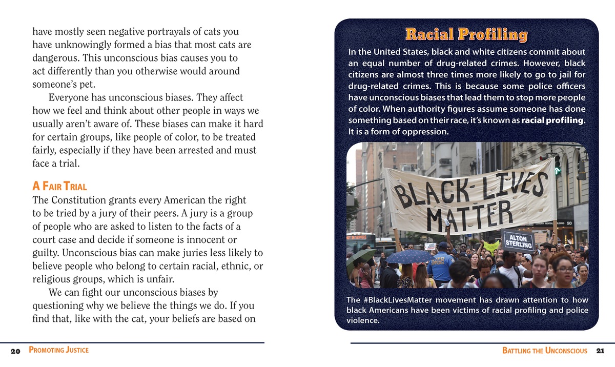 As more people are becoming politically engaged, the concept of social justice is rapidly becoming a hot topic. Help students learn about the concept of justice and how it relates to their lives. This book highlights not only the importance of justice but also the ways the criminal justice system can be unfair to minority groups. Students will learn about how unconscious biases affect the justice system and how they can combat them. With simple, accessible text, this book tackles the complicated topic of justice and teaches students how they can help create a better, more just society.