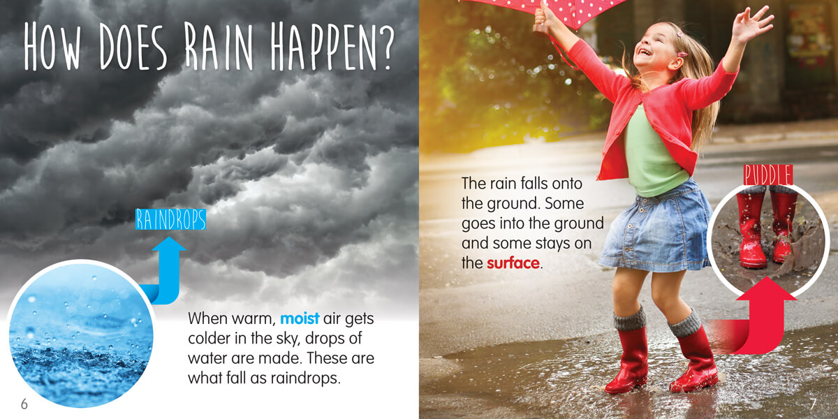 Whether a drizzle or a downpour, if you're not prepared for rain, it can ruin the day. On the other hand, rain can be fun to play in, and it is an essential element to life on Earth. Young readers learn how rain forms and about the water cycle, which are important concepts of the early elementary science curriculum. They'll learn about rain's significance to plants and animals. Carefully selected images support the well-crafted, accessible narrative, making this book perfect for visual learners.