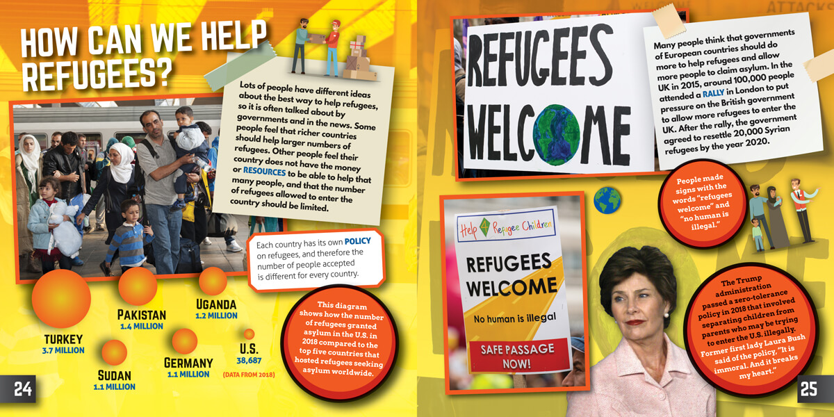Refugees are a hot topic in the news and politics. Young readers may not fully comprehend what it means to be a refugee, the complicated systems they must use to enter new countries legally, and the challenges they face adjusting to different cultures. This book presents these topics with easy-to-understand text and captivating photographs. Your readers will experience an in-depth look at what life is like as a refugee. They'll learn why people flee their home countries and about the dangers faced on this journey. How refugees can shape and contribute in a positive way to the new countries they call home is demonstrated.