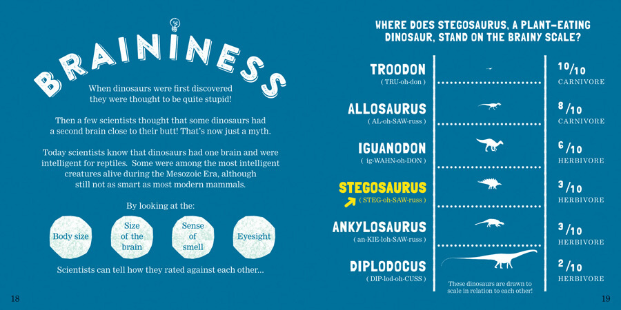 The Stegosaurus is known for the scales along its back, but did you also know the dinosaur had a brain the size of a ping pong ball? Eating both meat and plants, the Stegosaurus roamed the Earth during the late Jurassic period at 30 feet (9.1 m) in length. This volume contains a complete guide for anything a reader might want to know about the dinosaur, including fossils, sketches, fact boxes, and diagrams. Colorful graphics guide readers on their journey to learning about such a fascinating, prickly creature!
