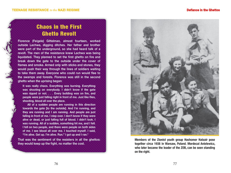 Both Jewish and Gentile teens played a key role in resisting the Nazi regime. Students will learn first-hand of the different resistance groups in Nazi Germany, from the anti-authoritarian pranksters Edelweiss Pirates to the communist Baum Group to the anti-fascist Christians of The White Rose. This book also examines resistance outside of Germany. While Western European countries focused on military resistance and rescuing children, resistance in Eastern Europe primarily meant survival, as Aryan-looking Jews became couriers carrying badly-needed food to those in need. Students may be inspired toward high-level ethical discussions of the role children played in certain resistance activities and the impossible choices faced by those embroiled in guerrilla warfare in the forests of Eastern Europe.