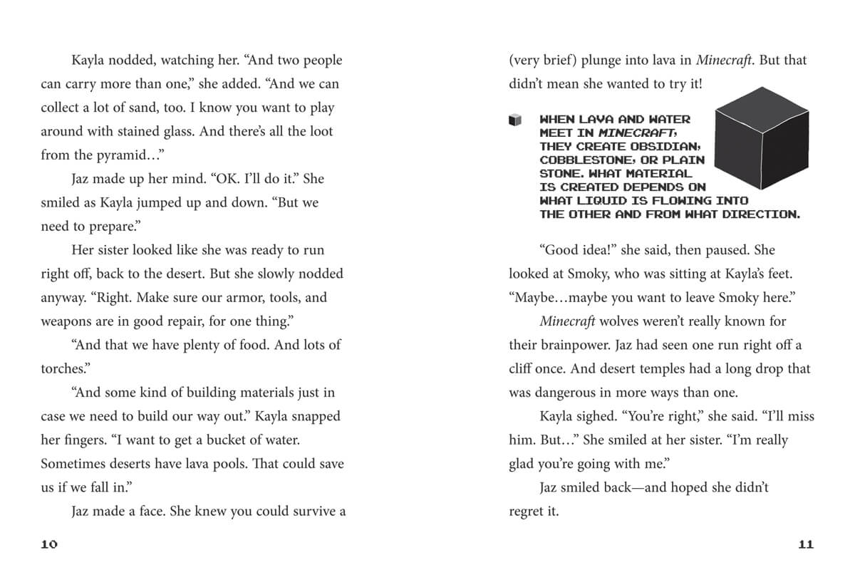 Kayla's main project in the group's Minecraft® base is the map wall. While she's filling out her third map, she comes across something special—a desert temple! Excited, she returns to enlist her sister Jaz to help with the adventure. Jaz, however, isn't sure she wants an adventure that includes dangerous falling sand, prickly cacti, husk zombies that can attack in daylight, and explosive TNT traps. Still, the sisters will need each other's skills to succeed and make it home with their loot.