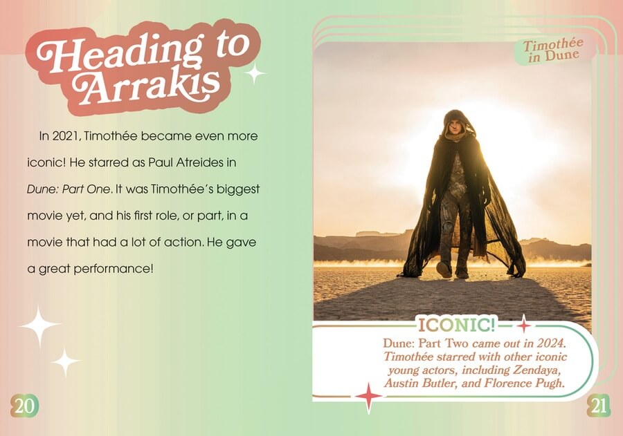 Timothée Chalamet has been impressing audiences with his subtle performances for years, but he's hitting new heights with the success of the Dune franchise he leads. There's no sign of him slowing down either! In this brief biography of Timothée Chalamet, readers learn how he got his start, his greatest accomplishments, and more! Written with reluctant readers in mind, this volume presents the most important details about Timothée in simple sentences, complemented by full-color photographs as well as informative fact boxes.