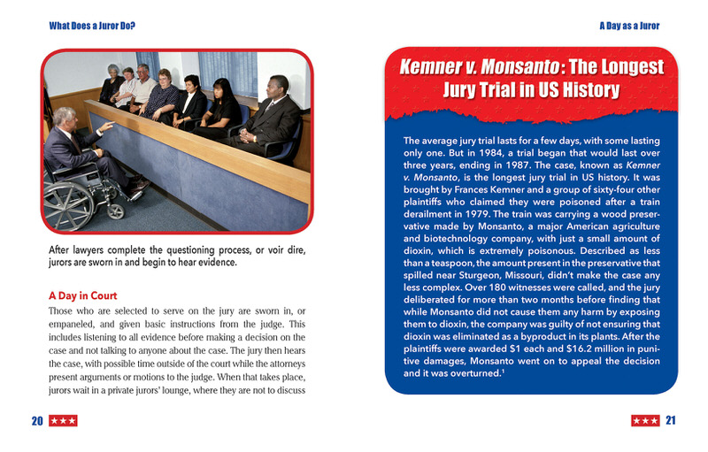 The Constitution of the United States lists many rights for citizens. A fair trial by jury is one of those rights. A jury is made up of people from the place where the crime happened. These jurors are picked from a pool of citizens. Jurors hear evidence and receive directions from the judge for the case. After hearing the case, jurors decide if a person is guilty or innocent. In some cases, jurors also decide the punishment. This book will explore what it means to be a juror through an inquiry-based approach aligned with C3 standards.