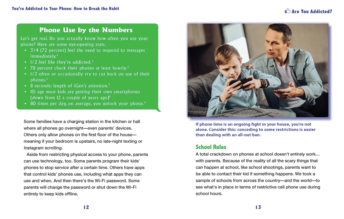 Want to see a teen freak out? Take their phone away. Phones seem to be as important as oxygen, but sometimes those little portals to the online world interfere with real life. This fun and informative guide will help painlessly wean teens off constant phone use by offering scale-back tactics, sharing what others have done that works, and explaining the physical and emotional repercussions of overuse so that teens don't have to miss out on anything IRL.